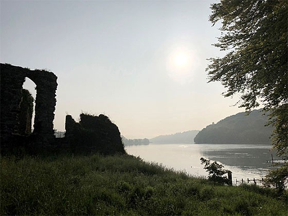 Yesterday’s path led us from our cottage down to the riverbank, where the earth had been diked up, creating a path from the main house to the ruins of an old abbey.