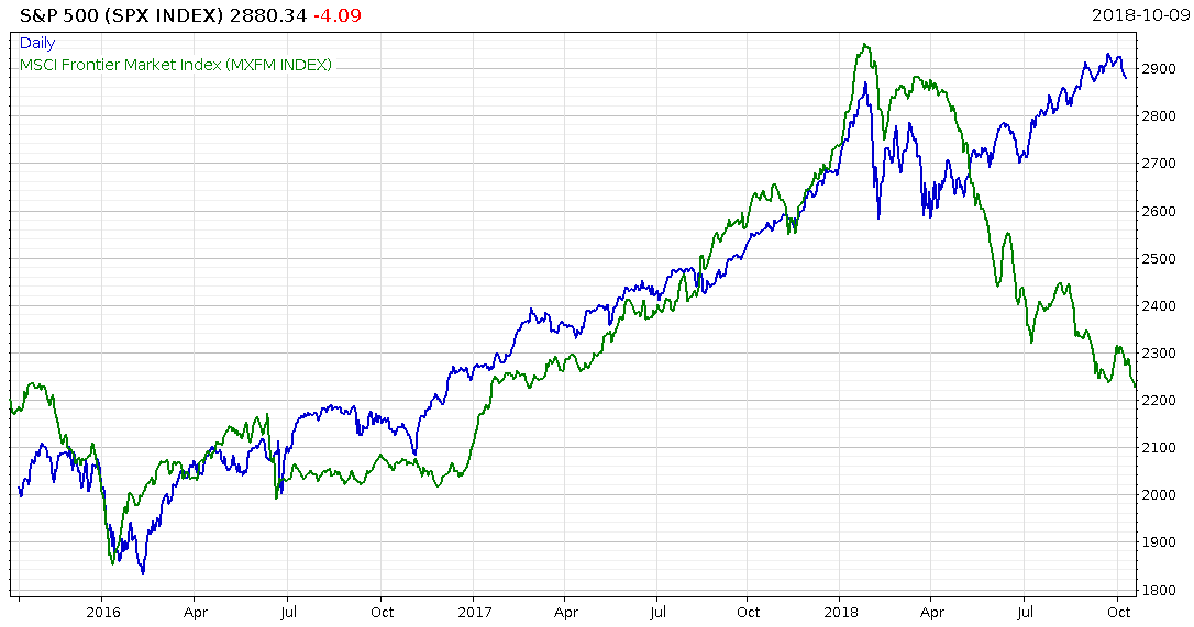 The Lone Ranger’s success is best illustrated on the frontier – his native element, after all. As you can see above, frontier markets were bested by the S&P (in blue) early in the year, and have yet to recover.