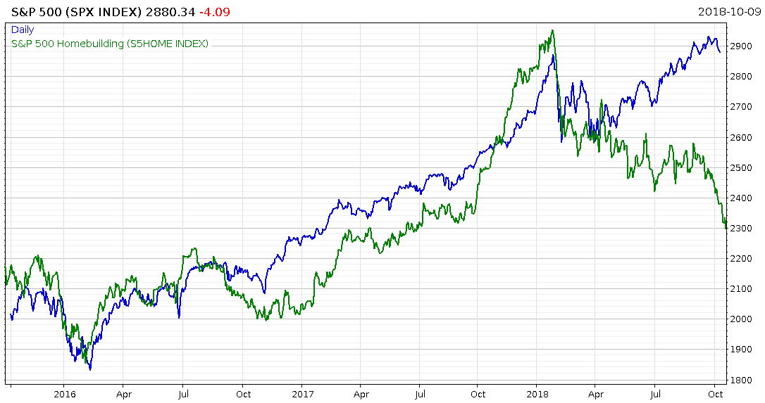 US homebuilding companies, an indicator of the vitality of the US economy, were left behind by the Lone Ranger at the beginning of the year, and are declining steeply as he disappears into the horizon. This could be a reflection of rising interest rates, but this decline is very steep indeed.