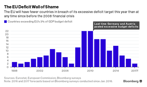 The other good news – which you might choose to see as bad news – is that this will be the lowest number of EU countries in breach of the deficit target since the start of the financial crisis in 2008. Everyone – apart from the fiscally flummoxed five – seems to have gotten their house in order. Why could that be bad news?