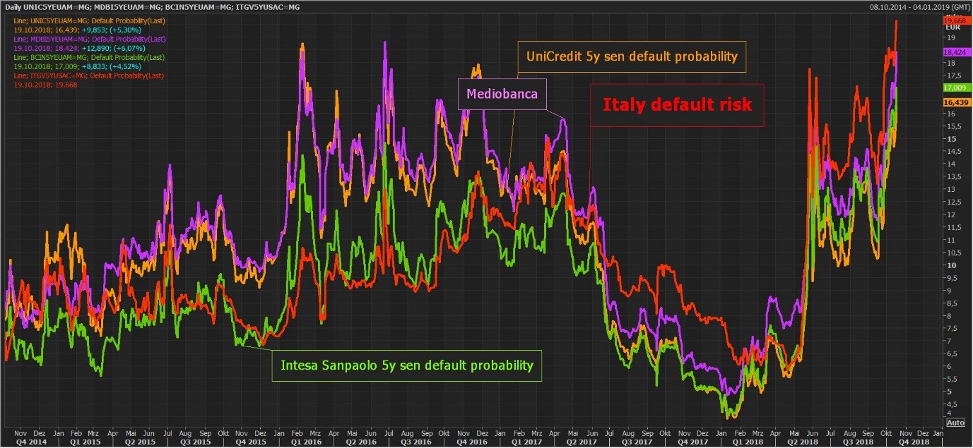 It’s a “doom loop”: collapsing confidence in the Italian government leads to a collapse in confidence in Italian banks, which leads to a further decline in confidence in the Italian government as it’ll then have a banking crisis on its hands on top of everything else.