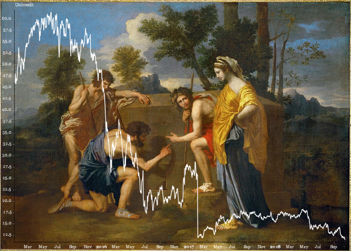 If you’d like to see a more modern depiction of what death arriving in paradise looks like, you need only look at the price action of an Italian bank. This is Unicredit, Italy’s largest: