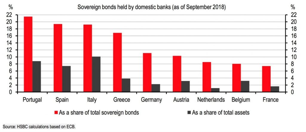 Italy’s banks are especially loaded up on sovereign bonds. This chart shows they have the highest proportion of sovereign bonds in Europe, as a percent of their total assets, in grey.