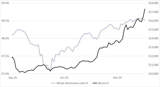 Source: ByteTree.com – bitcoin price $ (black) and the ByteTree Whale Dominance ratio (purple). Largest transaction value quintile relative to the lower four quintiles. Since September 2020.