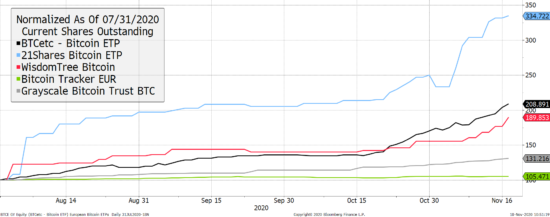 Source Bloomberg: Bitcoin funds shares outstanding since August 2020