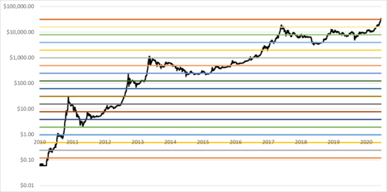 Using 6 cents as a starting point, BTC has doubled nineteen times – and came within a whisker to hitting to hitting its twentieth last month.