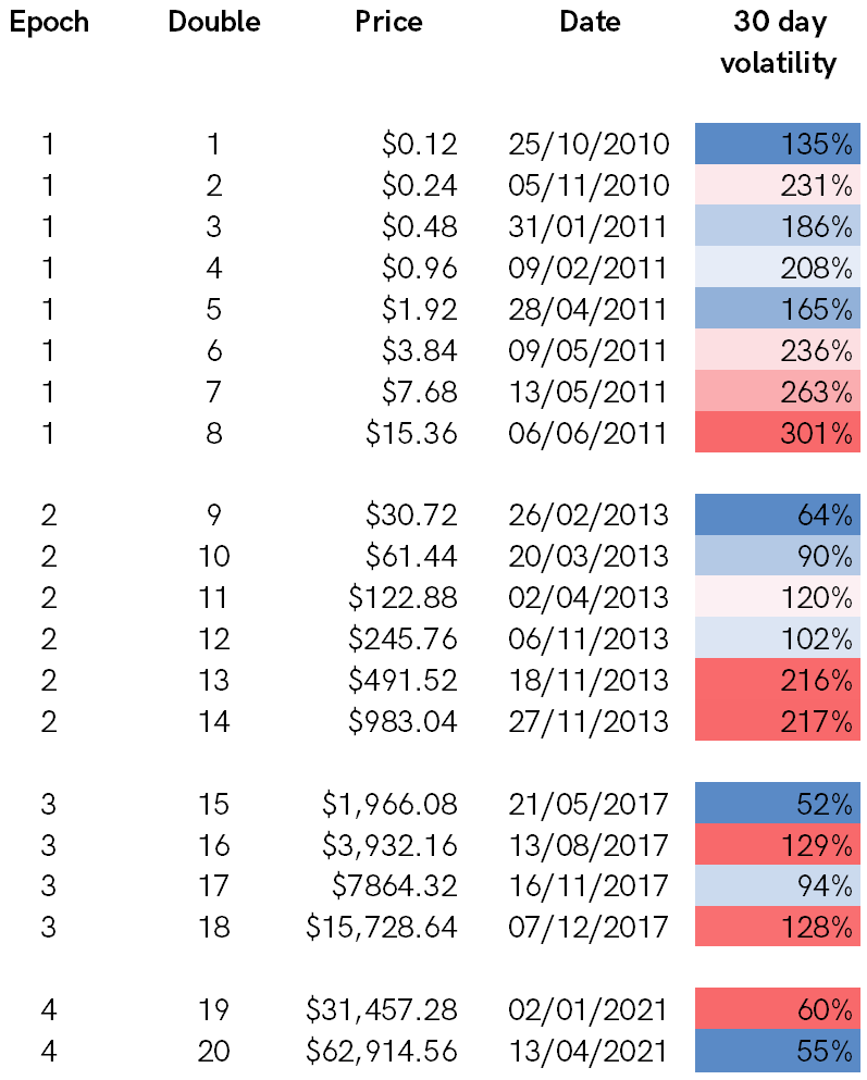 I have colour-coded by epoch, with red marking the highest readings. Typically, the early doubles occurred on relatively low volatility, in contrast to the later ones on higher volatility. Bitcoin’s historic average volatility has been 92% since 2010 and 63% since 2015.