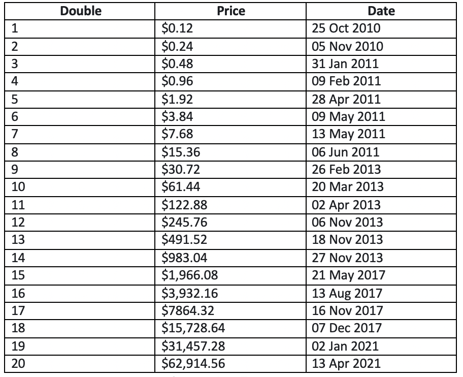 Lo and behold, we witnessed bitcoin’s 20th doubling on Wednesday when the BTC price touched $63k – and Charlie has since written an update. I thought I’d share it with you today. Not only because of this event we’ve been working on, but because this is a spectacle that deserves to be witnessed – be you an investor in bitcoin or not.