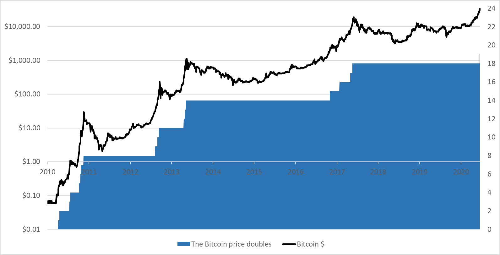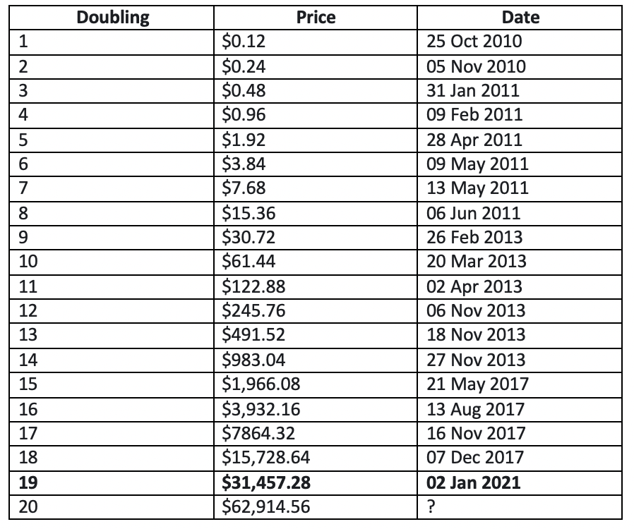 Using 6 cents as a starting point, BTC has doubled nineteen times – and came within a whisker to hitting to hitting its twentieth last month.