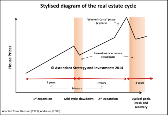 Here is my stylised representation of the real estate cycle. Each cycle consists of 14 years up into a peak, four years down into a low. And the 14-year expansion separated into two halves by a mid-cycle recession.