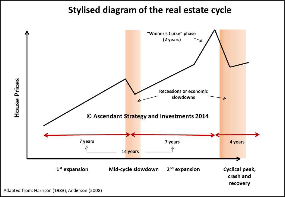 Here is my stylised representation of the real estate cycle. Each cycle consists of 14 years up into a peak, four years down into a low. And the 14-year expansion separated into two halves by a mid-cycle recession.