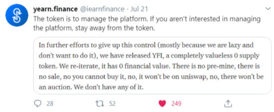The enormous boom in YFI actually led to the developers taking to Twitter to tell people not to buy the tokens unless they were actually interested in helping manage the network: