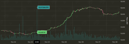 I meant to share this chart with you last week, but didn’t get around to it. On the night of the US election, a billion dollars’ worth of bitcoin was transferred over the network in an hour. Such a heavy load of transactions in a short period suggests the bulk of it was going to one individual or entity.