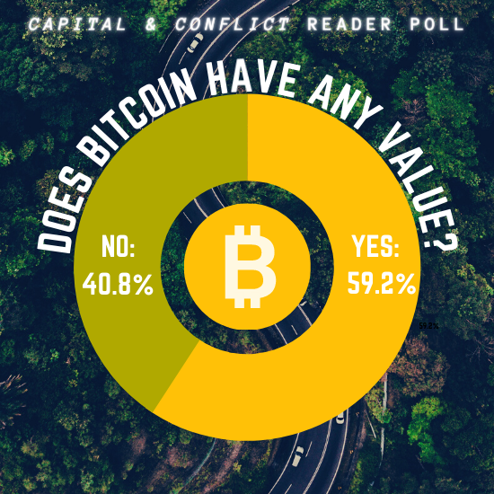 Looks like most of you think bitcoin does have at least some value – though there’s a significant minority who think it doesn’t. Fascinatingly, the divide here is only 0.1% off the results from our last poll, when I asked you if you thought the new lockdown measures were necessary or not (“Was it like this in East Germany mother?” – 28 September).