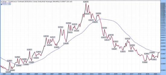 In effect, this is the value of the Dow Jones when measured in ounces of silver: when silver is a better buy than stocks, it goes up. When stocks are a better buy than silver, it goes down.