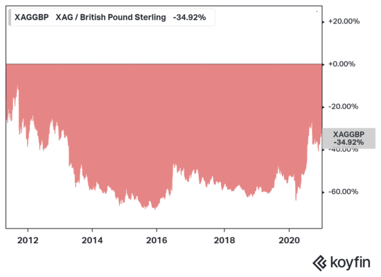 I’ve not been too quiet about my affection for this investment in the past. It’s silver – the white metal, gold’s hyperactive little sister. In March last year as its price was plummeting, I wrote in this letter that the silver buying opportunity of a decade would soon be upon us (When crises occur, this asset mysteriously disappears – 17 March 2020). Silver bottomed that very day at £10.28, so I wasn’t as early in alerting you as I’d like, but it stayed down there for a little while and I strongly believe there won’t be another opportunity to get in on silver that cheaply for at least a decade.