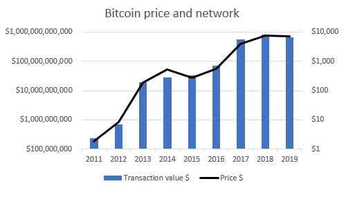 The chart below shows the average bitcoin price each year and the amount of money that transacts over the bitcoin network, known as transaction value $ (TV$).