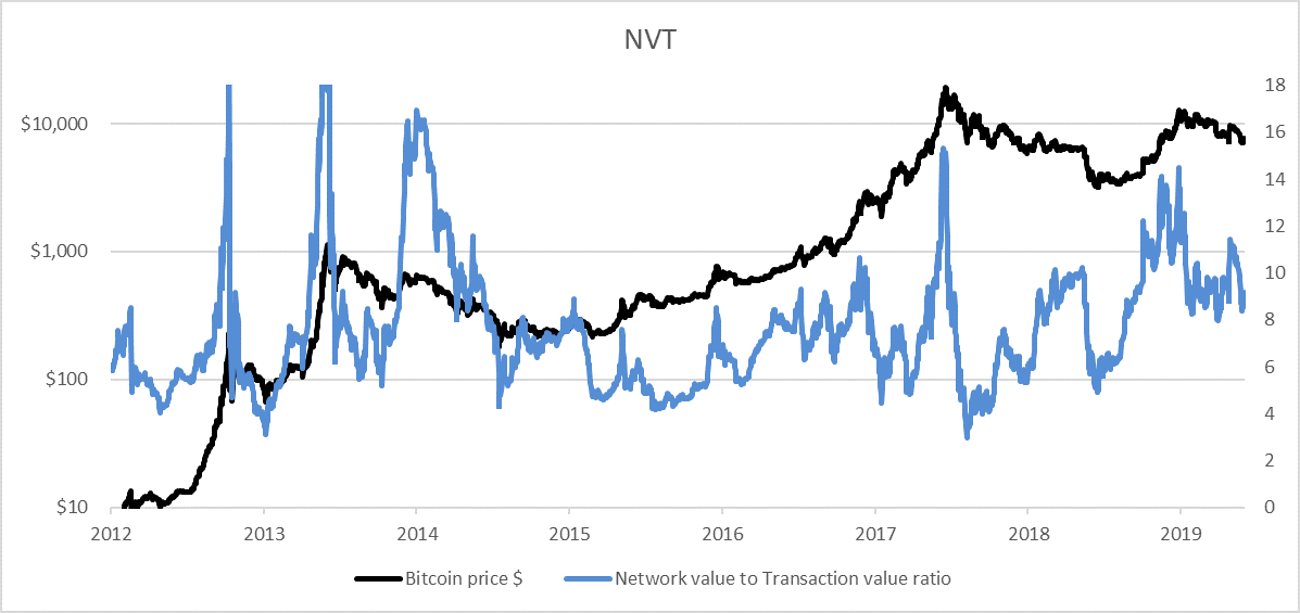 But recall that the average NVT is 6.8. The actual number at any one time varies between 5 and 15. Bitcoin is expensive when it is high and cheap when it is low. It is simple stuff, and just like an equity price to earnings ratio, you should buy low and sell high.