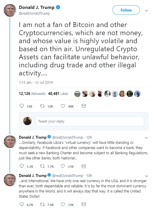 The US president used his Twitter account to extol the strength of America’s “cherished DOLLAR” in the past, railed against the “devalued” euro, and continually attempted to goose the stockmarket higher with it, but this marks the first time the crypto world has been honoured with such a tweet.