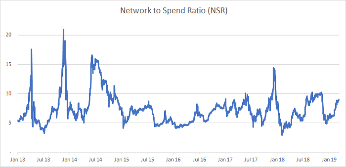 Meet the innocuous sounding Network to Spend Ratio, or NSR. Put simply, this is a measure of how high the market is valuing bitcoin, relative to how much people are actually using it. If the market is pricing bitcoin highly, and yet little value is being transacted across the network, this is a sign that BTC is overvalued. Conversely, if much value is being sent across the network, but the bitcoin price is low, this would indicate that BTC is undervalued.
