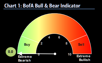 This sentiment is not echoed everywhere, however. Bank of America’s “Bull & Bear” gauge of market sentiment, intended to be used as a contrarian buy or sell signal, is now at absolute zero – as bearish as it gets: