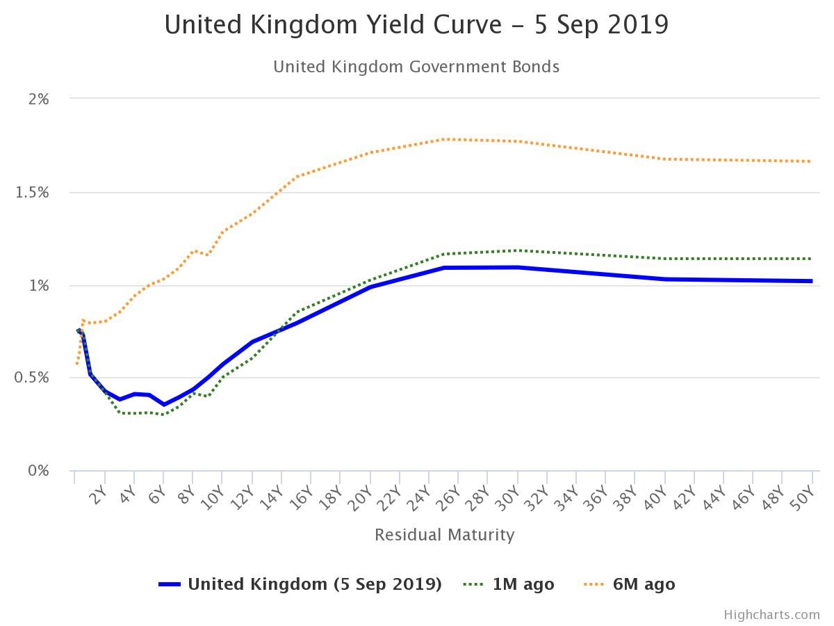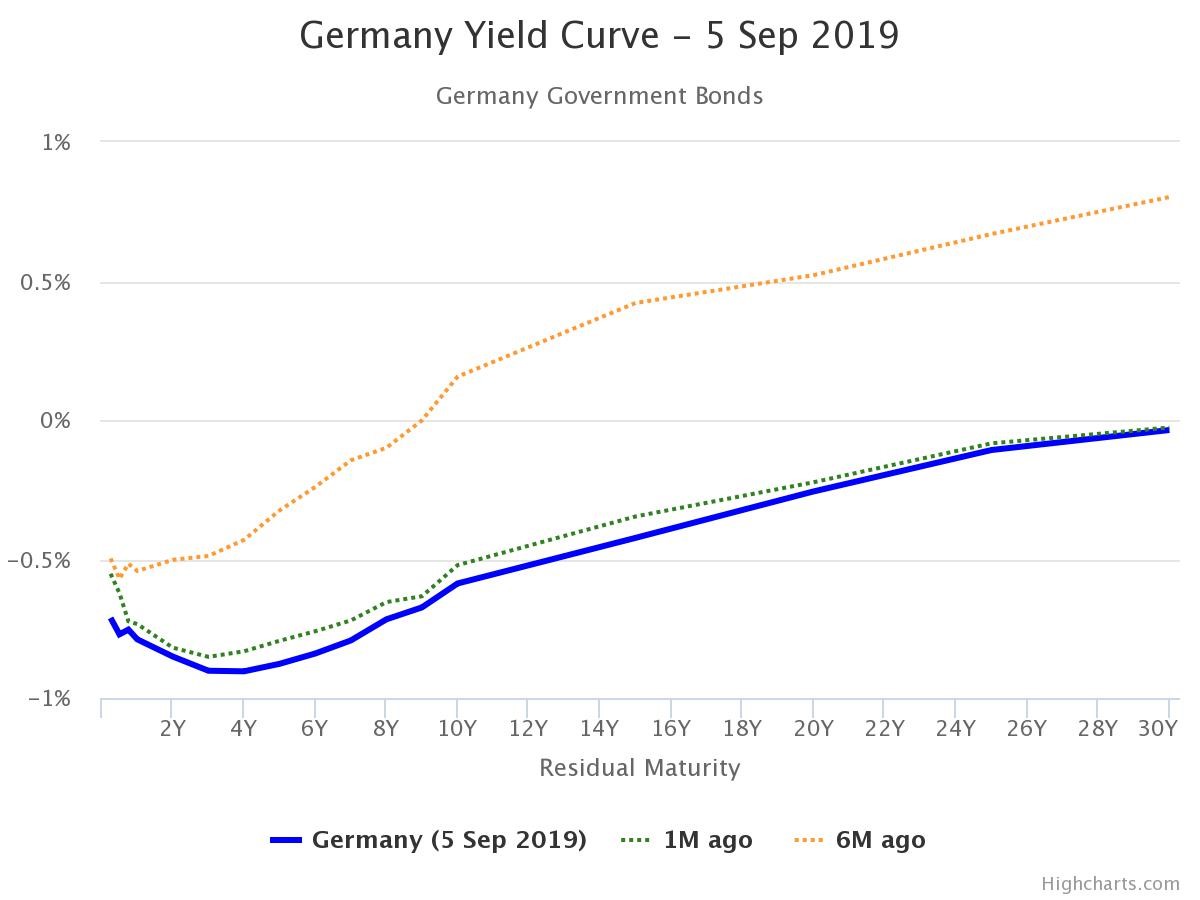 If we turn to a developed nation whose currency is not graced by our monarch, things start to look a bit negative. You look to say, Germany, and that blue line is completely submerged (just as its banks soon will be who use these bonds as collateral in their lending), in a brutal change from six months ago: