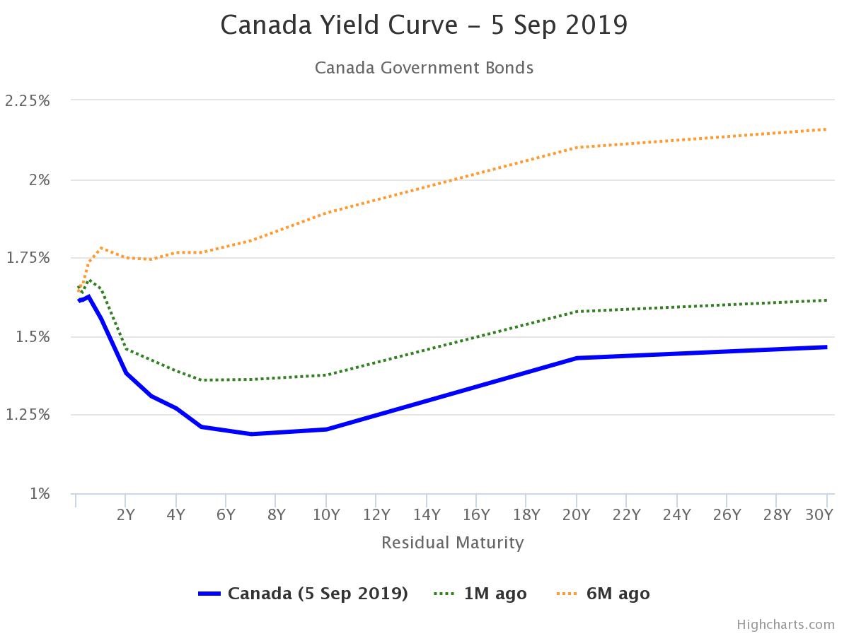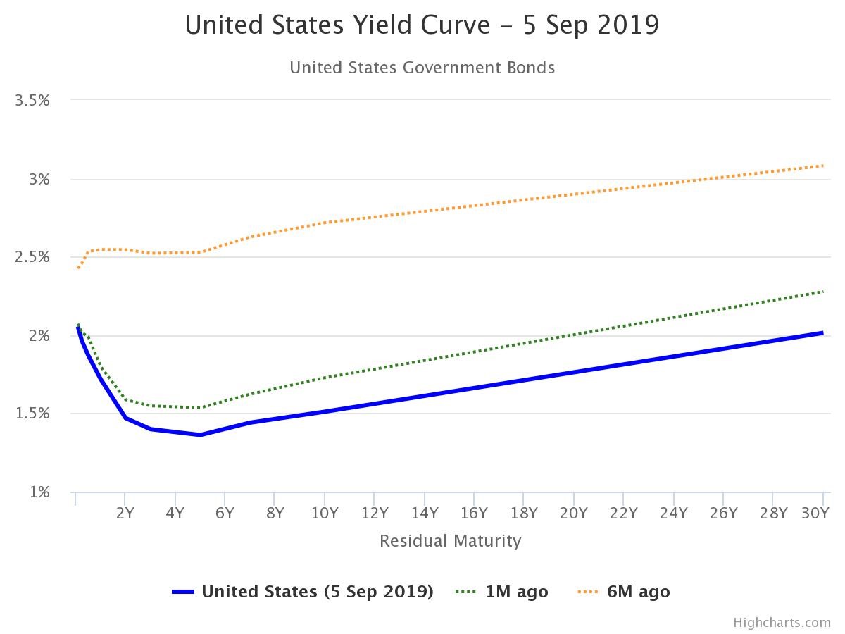Take a look at this chart and focus on the blue line. This is a yield curve, showing how much the government pays on different durations of debt. The yield paid is displayed on the left, with the duration of the loan displayed on the bottom.