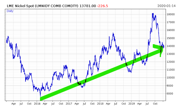 Nickel, used mostly in batteries, is a great example, continuing to tear up the way: