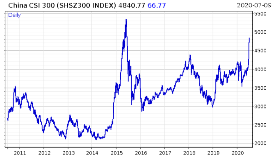 Considering how vertical the Chinese stockmarket has gone in the past few months, I wouldn’t be surprised if that photo was indeed taken in the recent past. Since March, the CSI 300 – the top 300 stocks on the Shanghai stock exchange – has gone almost vertical: