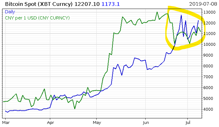 As you’ll likely know by now, my explanation for Bitcoin’s rise this year is that wealthy Chinese citizens have been using it smuggle their capital out of the country. The trade tensions between the US and China (a symptom of Cold War II) took their toll on the renminbi very strongly in May; this exacerbated fears that the Chinese Communist Party would devalue their currency to remain competitive despite US tariffs. The fall in purchasing power of the renminbi correlated strongly with a rise in BTC, and notably this relationship seems to work in reverse too.
