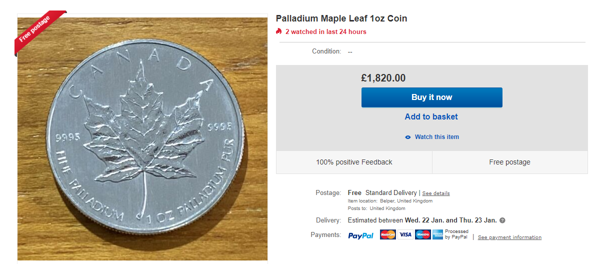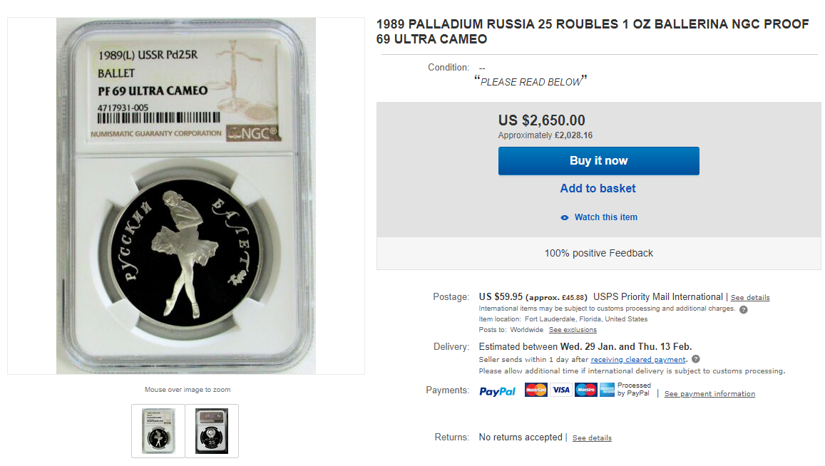 Even more telling, I found one chap selling another palladium coin (a Canadian Maple, not a Ballerina) at less than market prices.