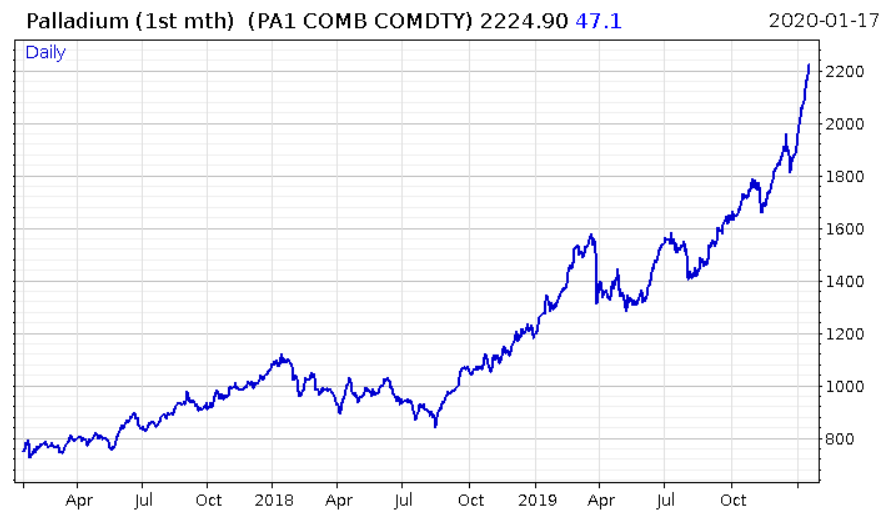 Palladium demand has effectively been ordered to go up by governments around the world who have decreed there must be less automobile emissions, one way or another. Palladium, the vital ingredient in catalytic converters in petrol cars, has been bid up massively, thanks to a series and worldwide increase in environmental regulation.