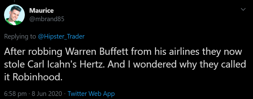 We explored this a little yesterday with the $JETS airline ETF being bought in size by millennials after Warren Buffett sold his airlines, leading to large profits for those involved. There’s a similar story in play where Carl Icahn, the billionaire hedge funder who owned a large stake in Hertz ($HTZ), sold it all in May at a significant loss, only for the Robinhood crowd to buy it up and now sit on triple-digit gains. I found this remark from a trader on the transfer of wealth from the billionaires to the younger generation interesting: