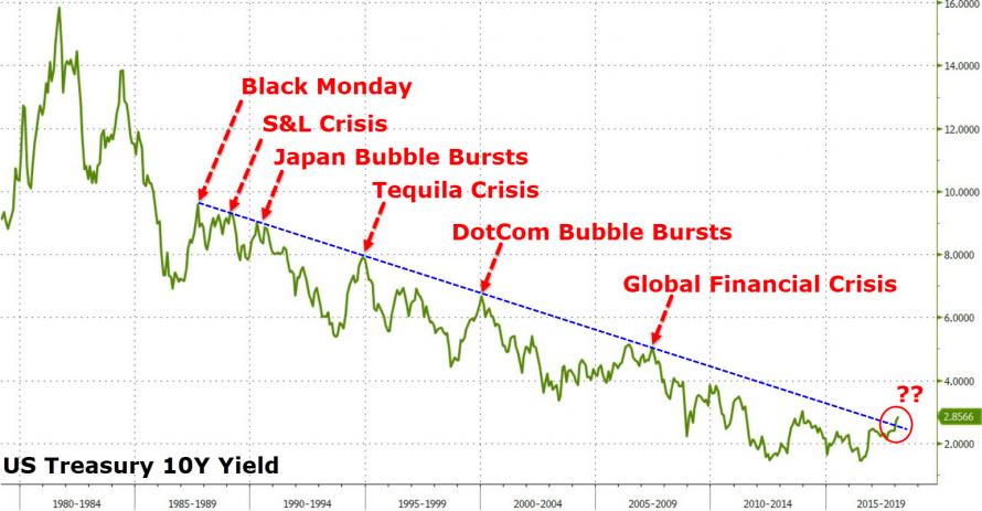But it hasn’t been smooth sailing. Each time interest rates spiked on their 35-year downtrend, we saw some sort of financial crisis. Then rates are cut. It’s an extraordinarily consistent cycle.