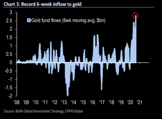 While gold remains small relative to the tech titans, investor interest in it has amped up, with record flows running into gold funds. We may be talking about “only” a few billion dollars going into the shiny stuff over that past month and a half, but that’s more than has been recorded in the past: