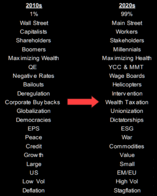 “YCC & MMT” = Yield Curve Control & Modern Monetary Theory. “Helicopters” used as shorthand for “Helicopter Money” – central banks financing (printing) government spending. EPS to ESG = earnings-per-share to environmental, social and governance standards. “Vol” – volatility.