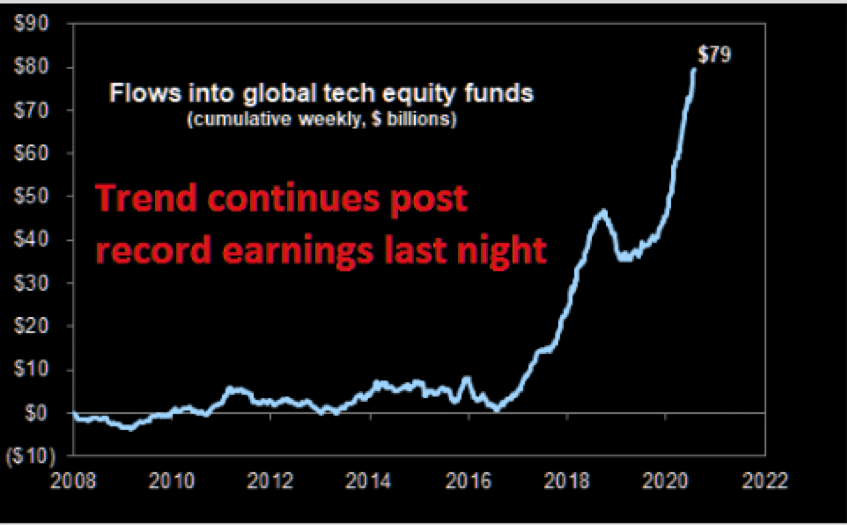 Here’s one trend from the late 2010s that’s certainly getting long in the tooth: tech. Flows of capital from investors into tech funds just continues to soar and soar after bottoming in 2016. The rise in interest rates we saw in 2018 staunched the flow for a while, but not for long: