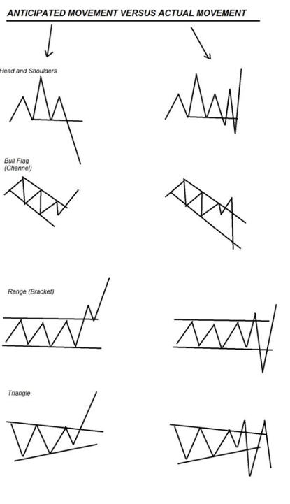 Left column indicates “classic” patterns which if a trader can see forming, should be able to profit from before it is completed. Right column is what often happens instead.