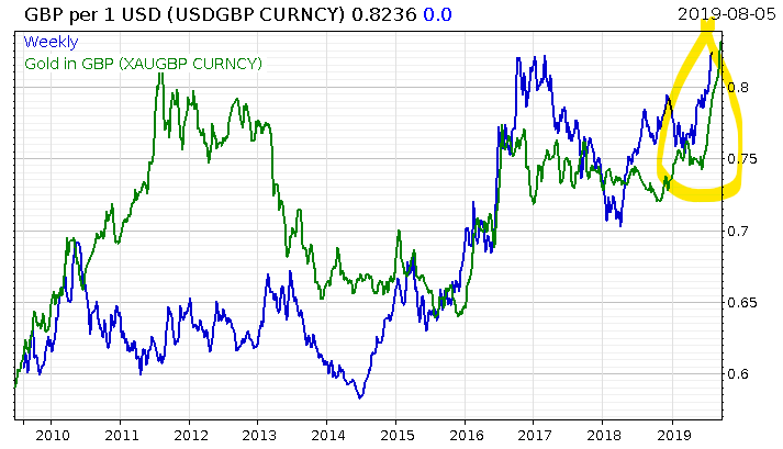 The joy for the British gold bug is bittersweet, as the recent all-time highs have been heavily helped by the fall of the pound. Tightly accompanying the rise of gold in sterling is the dollar: