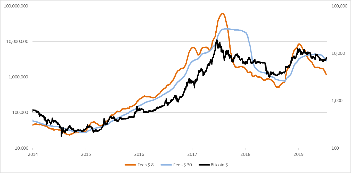 There was a smaller trading opportunity again last year. The price was around $4,000 when the network showed positive signs and around $10,000 when it declined again. Fees are a very simple way to follow the network trend.