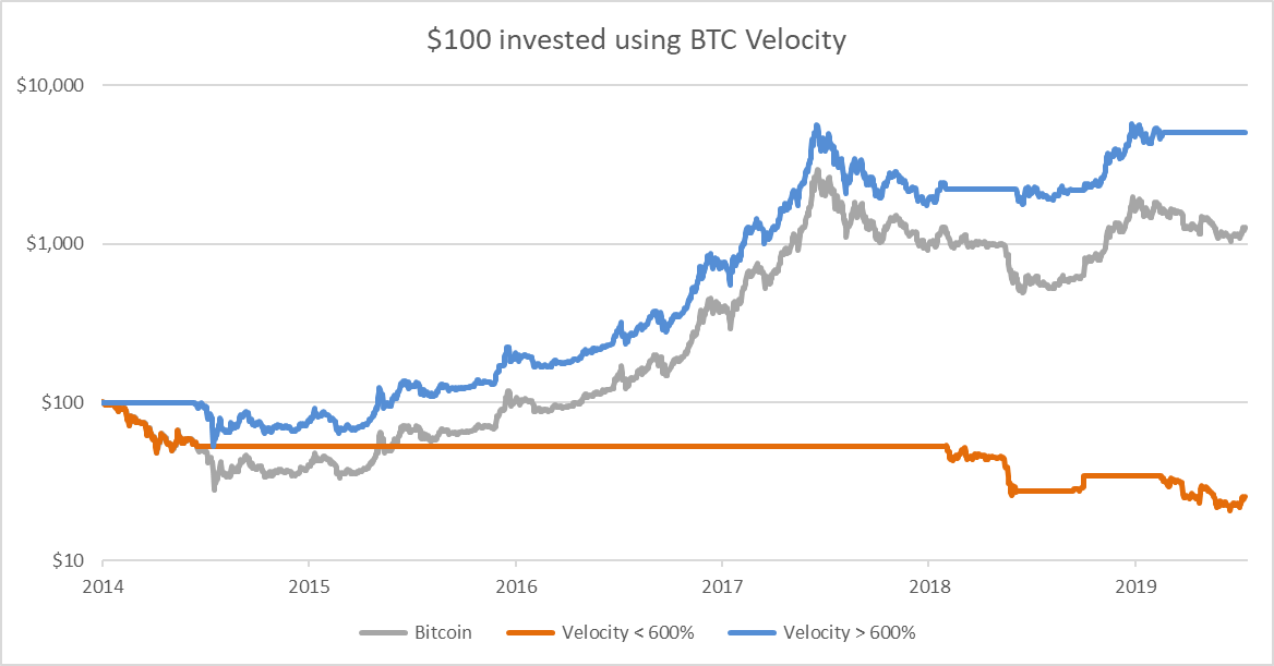 The results are incredible. By investing in bitcoin when velocity is greater than 600%, you missed most of the bear markets in 2014, 2018 and today. Buy and hold would have turned $100 into $1,000, which is great, but the strategy of investing in a market with healthy velocity turned it into $5,000. Weak velocity, on the other hand, turned that $100 into $27.