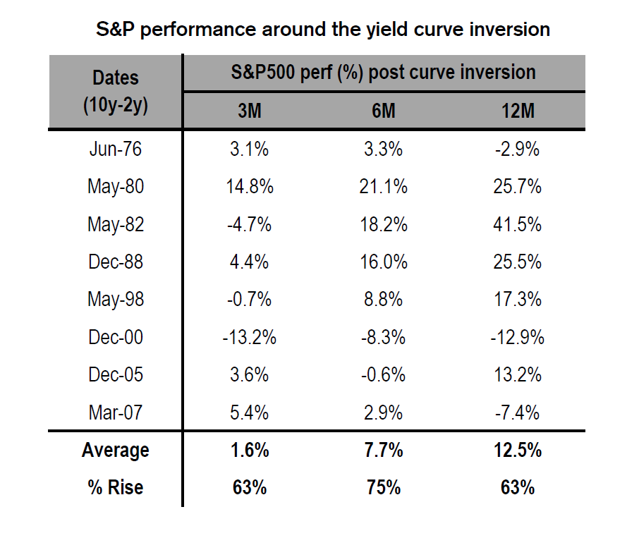 I found a recent table which maps out just how high this can be, and the performance of the S&P 500 three months, six months, and 12 months after each historical inversion has taken place is revealing: