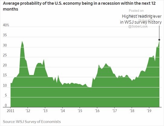Economists surveyed by the Wall Street Journal have never had such conviction that a recession is on the way…