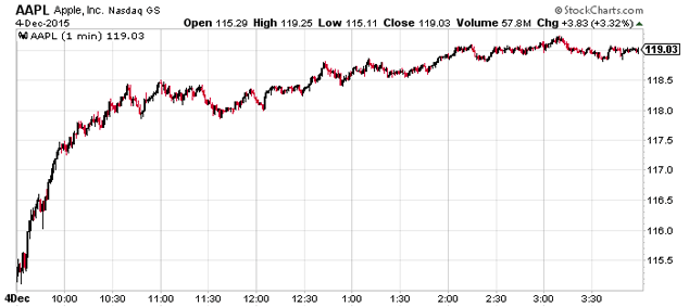 It’s a green light to ‘price in’ higher US rates and a stronger US dollar. If you wanted to make things really easy, and you were betting on the US dollar being ‘stronger for longer’ in 2016, then the simplest strategy is to buy Apple Inc. See the chart below. While the Dow Jones Industrials climbed 2.12%, Apple climbed 3.32%.