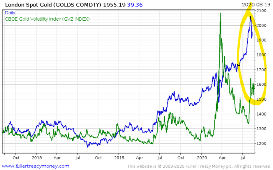 This may be because market participants are used to the gold price going down or simply expect it not to increase for some reason, so higher prices catch them unawares. But for whatever reason, the link between the two isn’t severing, even in the face of some pretty major price moves. The hefty whack gold received over the past week – which would have sent volatility in the stockmarket soaring – soaring, stopped gold volatility in its tracks, pushing it flat: