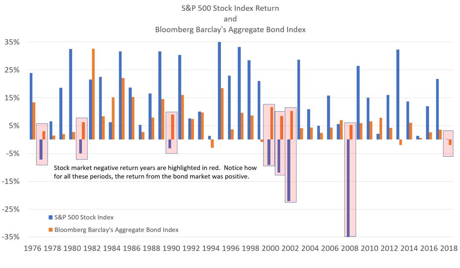 As this chart courtesy of East West Investment Management illustrates, all of the really bad years for stocks in recent history have been good years for bonds. And there hasn’t been a year in recent history when both stocks and bonds ended the year in the red… until now.
