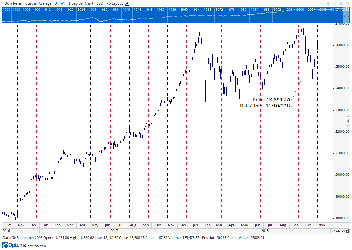 Both Gann and the Celts knew what they were talking about. Those dates are important times of the year. Take a look at the following chart of the Dow Jones Industrial Average over the past two years.
