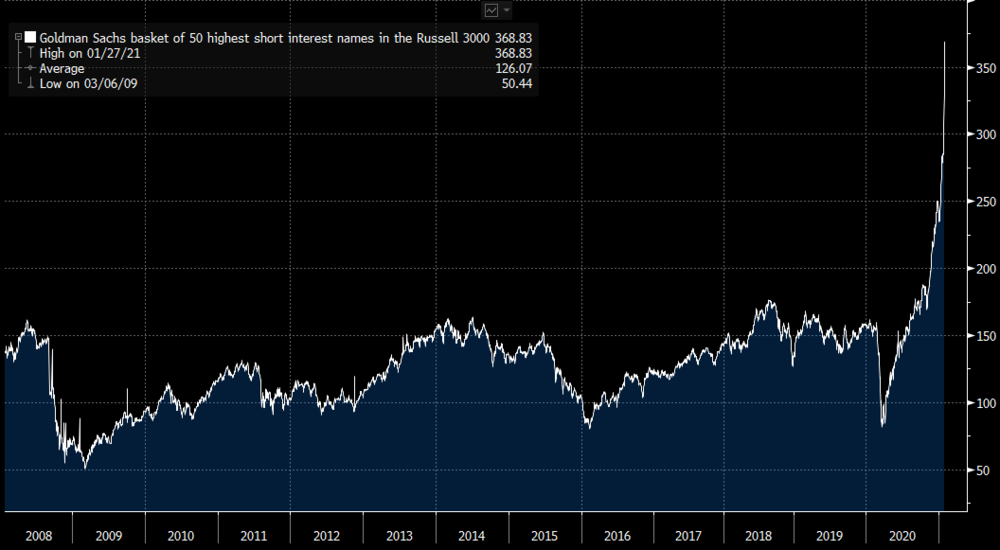 We mentioned the rally in video game retailer GameStop ($GME) orchestrated by the WallStreetBets Reddit forum briefly in Wednesday’s note (The Abominable 20). The disruption caused and success reaped by this group of millennials in deliberately trying to trigger short-squeezes and thus bankrupt short sellers is a fascinating spectacle, which is now attracting significant press attention.