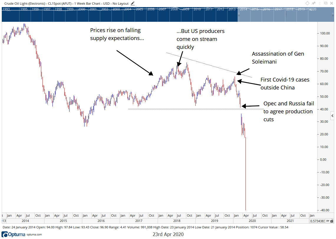 Among the cycles Akhil studies are commodity cycles, and he often looks at oil as a gauge of where we are in the broader investment cycle. But in his latest piece, he notes that the advent of negative oil prices is unprecedented within the historical cycle of oil prices, and so investors need to trust the rhythm of the market instead, using signals as they come up. It’s a bit like navigating without a map, or playing a tune by ear – but I’ll let him explain what he means…