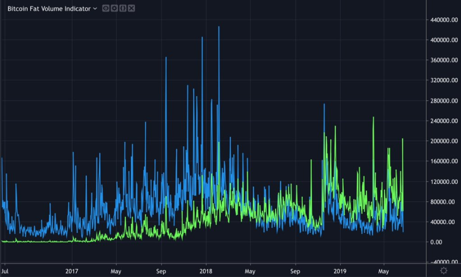 Bitcoin volume in USD (blue) compared to bitcoin volume in Tether (green)